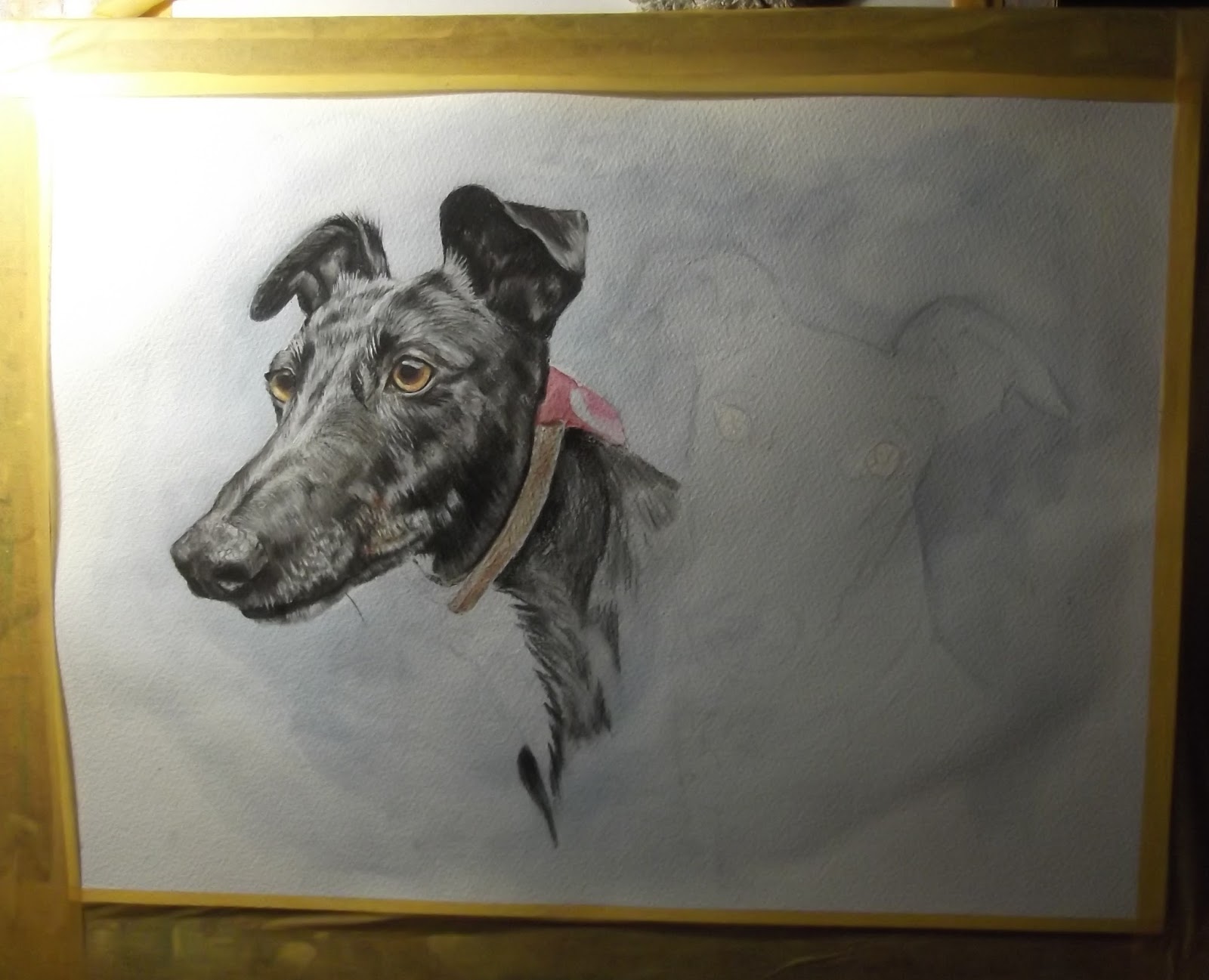 I thoroughly enjoyed painting a different kind of dog - I seem to paint a lot of lurcher types and labradors. Nothing wrong with those, it's just nice to ring the changes occasionally. However, next up are a pair of greyhounds - the photo session for them was a nightmare, they just wouldn't keep still! Out of 40 photos taken, I managed to get 2 that are workable.